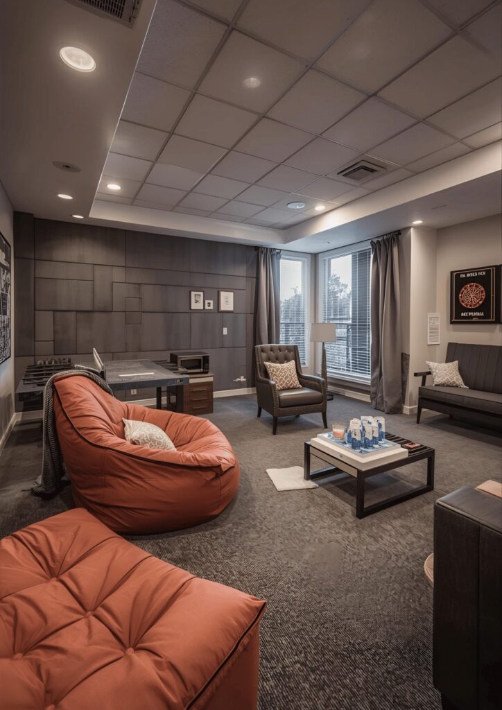 Give your teenagers an awesome and safe space to hang out with friends by soundproofing the walls to keep the noise contained. Furnish the area with durable and comfy bean bag chairs, a futon, and plenty of floor cushions for flexible seating during movie marathons. Add classic entertainment options like a ping pong table, foosball table, or a dartboard to encourage friendly competition and fun. Create a snack station with a microwave and mini-fridge stocked with drinks and popcorn for easy refreshments. This supervised retreat provides them with independence while giving you peace of mind.