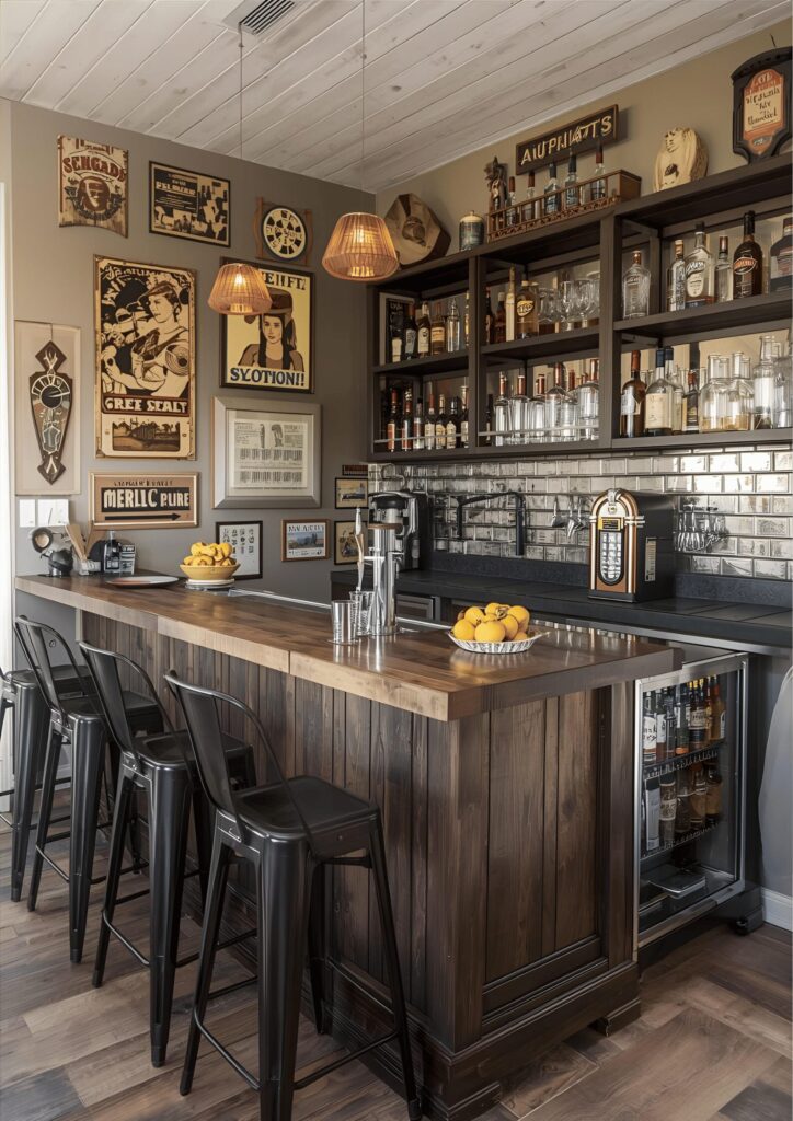 Build your own neighborhood pub by constructing or repurposing a rustic wooden bar as the central focal point of the space. Add character with barstools, unique pendant lighting, and a mirrored backsplash to make the area feel more open and inviting. Stock a small refrigerator for beer and wine and install shelving to display your favorite spirits, glassware, and cocktail accessories. Incorporate pub-style decor like vintage signs, a dartboard, and a jukebox or Bluetooth speaker for the perfect ambiance. This is the ultimate setup for hosting casual get-togethers and enjoying a nightcap without leaving home.