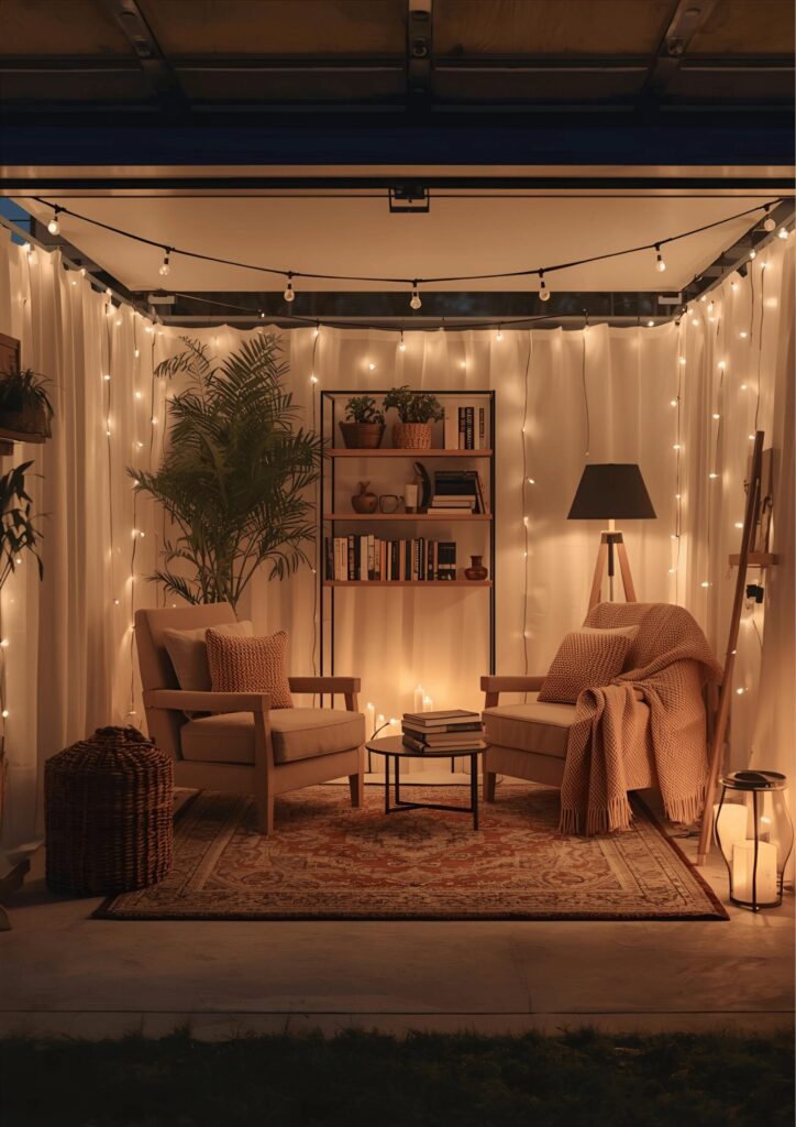 Claim a serene corner of the garage just for yourself by using room dividers or curtains to section it off from storage areas. Create a cozy and inviting atmosphere with soft rugs, plush armchairs, and an abundance of throw pillows and warm blankets. Incorporate plenty of soft lighting from floor lamps, string lights, and scented candles to establish a calming mood after a long day. Add personal touches like a small bookshelf for your favorite novels, an easel for painting, or a yoga mat for meditation and stretching. This personalized she shed offers a perfect quiet escape to relax, recharge, and pursue your hobbies in peace.