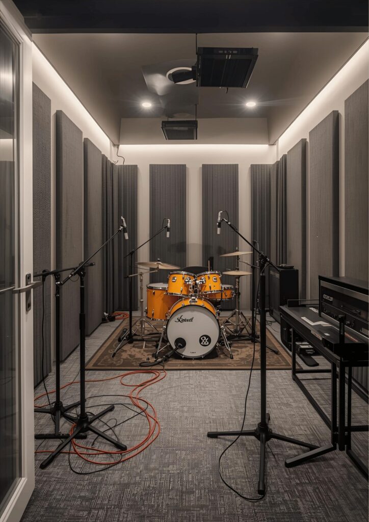 Soundproof your garage walls and ceiling with specialized acoustic panels and weatherstripping on the door to contain the noise. Set up a designated area for your drum kit, amplifiers, and microphones with plenty of accessible power outlets for all your equipment. Install practical yet cool LED strip lighting that can be adjusted to set the right mood for creative jam sessions and recording. Keep cables safely organized and out of the way with floor cord covers to prevent tripping hazards during energetic practices. This dedicated band space allows musicians to play loudly and freely at any time without disturbing the neighbors or household.