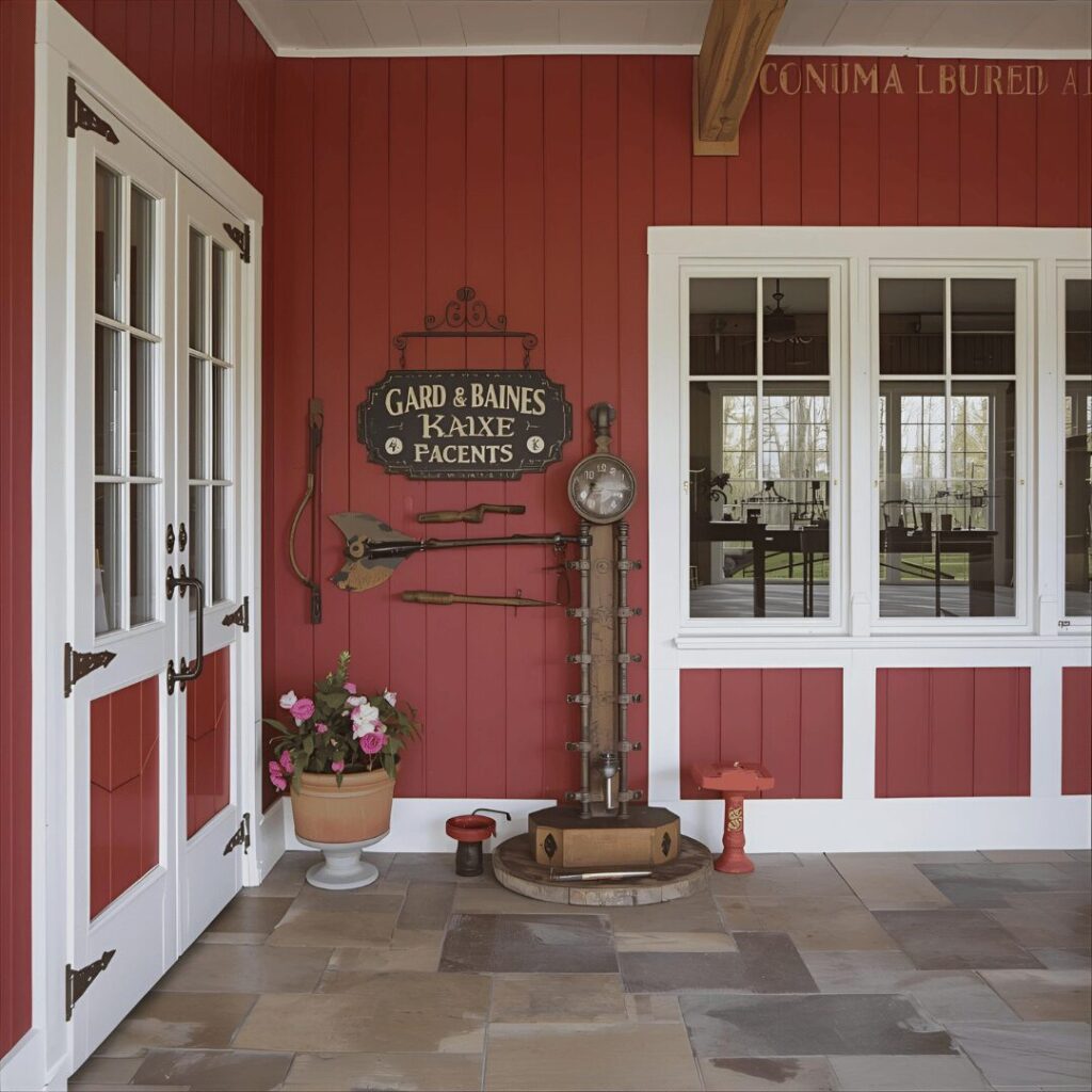 The rustic red barn aesthetic brings countryside charm and traditional warmth to your garage through classic barn red paint combined with natural wood accents and vintage-inspired details. This nostalgic color choice creates an inviting, homey atmosphere that works particularly well for garages housing garden equipment, woodworking tools, or classic vehicles that complement the vintage vibe. Barn red walls provide a warm, rich backdrop that hides dirt and wear while creating a cozy environment that feels less sterile than typical garage spaces. Combine the red walls with white trim around doors and windows, exposed wood beams if possible, and perhaps some vintage signage or antique tools displayed as decor for authentic rustic character. This aesthetic is perfect for homeowners with country or farmhouse-style homes, vintage car collectors, woodworkers who appreciate traditional craftsmanship, or anyone drawn to Americana and nostalgic design elements, creating a garage that feels like a welcoming workshop barn where honest work and timeless hobbies are celebrated.