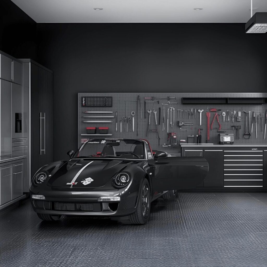 The sleek black feature wall makes a dramatic contemporary statement by painting one wall (typically behind a workbench or vehicle) in deep matte or satin black for maximum visual impact. This bold design choice creates instant sophistication and serves as the perfect backdrop for displaying organized tools, creating a magnetic wall with tool storage, or showcasing a prized vehicle collection. Black walls in garages work surprisingly well despite concerns about darkness because the contrast with lighter surrounding walls actually creates depth and dimension rather than closing in the space. The dark backdrop makes chrome tools, silver equipment, and organized pegboards pop visually, turning functional storage into an attractive display that looks intentional and curated. Ideal for modern minimalists, luxury car owners wanting a gallery-like setting for their vehicles, or tool enthusiasts who want their equipment to shine, a black accent wall combined with bright white ceilings and excellent lighting creates a high-contrast, contemporary space that feels more like a professional showroom than a typical suburban garage.