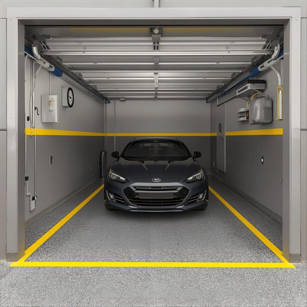 The safety yellow accent stripes combine practical safety features with visual interest by adding high-visibility yellow stripes or borders throughout your garage for both function and style. This practical approach includes painting yellow stripes along the base of walls to protect from vehicle bumpers, around support columns to prevent parking accidents, along step edges for safety, or creating parking guides on the floor. The bright yellow provides important visual cues that prevent damage to both your garage structure and your vehicles while adding an industrial, professional appearance reminiscent of commercial parking facilities. Beyond safety markings, yellow accent stripes on gray walls create a modern, energetic aesthetic that’s popular in contemporary design and brings youthful vibrancy to the space. Perfect for garages with tight parking situations, homeowners with teen drivers still mastering spatial awareness, or anyone who appreciates industrial design aesthetics, safety yellow accents prove that practical features can also be attractive design elements that contribute to your garage’s overall visual appeal while serving important protective functions.