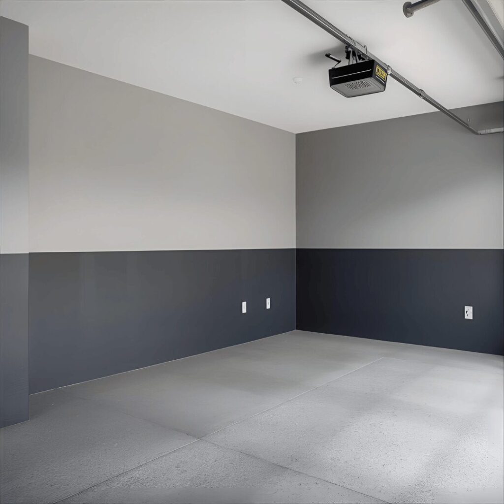 The sophisticated two-tone gray approach uses different shades of gray on walls and lower sections to create visual interest while maintaining a modern, masculine aesthetic. This popular design typically features lighter gray on the upper walls and darker charcoal or slate gray on the lower four feet, creating a practical barrier that hides scuffs, dirt, and wear from daily garage activities. The two-tone technique adds architectural interest to plain garage walls, breaking up the monotony of single-color surfaces while maintaining a cohesive, professional appearance. Gray is incredibly practical for garages because it doesn’t show dirt and stains as readily as white, yet it still provides good light reflection and a contemporary feel that works with any decor style. Perfect for car enthusiasts who want a sleek showroom vibe, homeowners converting their garage into a home gym or workshop, or anyone seeking a modern industrial aesthetic, this two-tone gray scheme creates depth and sophistication while remaining highly functional and forgiving of the inevitable wear that garage spaces endure.