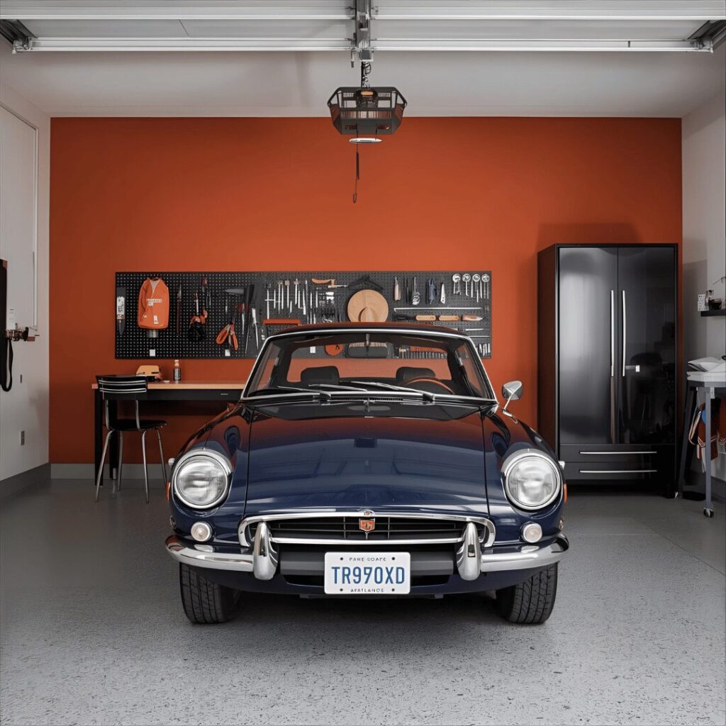 The navy blue sophistication approach uses deep, rich navy walls to create a bold, elegant garage that feels more like a refined gentleman’s club than a utilitarian storage space. This dramatic color choice works surprisingly well in garages by adding depth and character while still being dark enough to hide minor imperfections, grease stains, and daily wear. Navy creates a stunning backdrop for metallic tools, chrome fixtures, and organized pegboard systems, making your equipment look like intentional decor rather than cluttered necessities. The deep blue provides excellent contrast for light-colored vehicles, making them pop visually when parked, and creates a sophisticated atmosphere for car enthusiasts who view their garage as a showroom. Ideal for luxury vehicle owners, collectors, or anyone wanting to elevate their garage beyond basic functionality, navy blue walls combined with white trim, good lighting, and perhaps brass or copper accents create a space that feels deliberately designed, luxurious, and worthy of the quality tools and vehicles it houses.