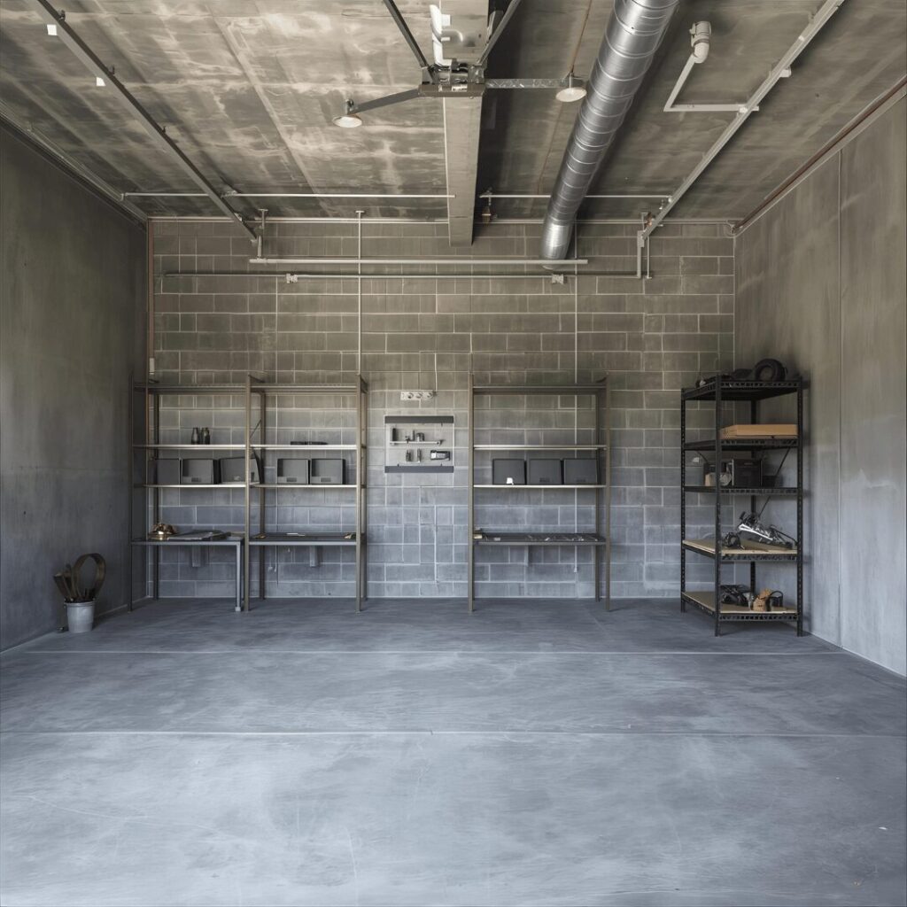 The industrial exposed concrete look embraces raw, urban aesthetics by using concrete-colored paint or actually sealing and treating existing concrete walls for an authentic warehouse vibe. This edgy style celebrates the garage’s utilitarian nature rather than trying to disguise it, creating a space that feels honest, masculine, and perfectly suited for serious work. The concrete aesthetic pairs beautifully with metal shelving, industrial lighting, exposed ductwork, and minimalist organization systems, creating a cohesive workshop environment that prioritizes function and durability. For those with concrete block walls, applying a concrete sealer with slight gray tint enhances the natural texture while protecting against moisture and staining, maintaining the industrial look while improving longevity. Perfect for mechanics, woodworkers, metalworkers, and anyone drawn to industrial design aesthetics, this approach requires minimal maintenance, hides imperfections beautifully, and creates an authentic workshop atmosphere that feels both trendy and timeless, proving that sometimes the best design choice is enhancing what’s already there rather than covering it up.