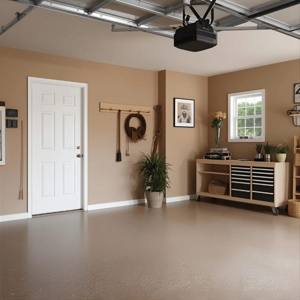 The warm beige and tan tones create an inviting, comfortable garage atmosphere that feels less utilitarian and more like an extension of your home’s living space. This approachable color scheme uses soft neutral tones like sandy beige, warm taupe, or creamy tan that provide a cozy alternative to stark white while still offering good light reflection. Warm neutrals work beautifully in garages that double as workshop spaces, craft rooms, or hobby areas where you’ll spend extended periods and want the environment to feel welcoming rather than cold and industrial. These colors also coordinate effortlessly with wood storage solutions, natural fiber baskets, and earth-tone organization systems, creating a cohesive aesthetic that feels intentionally designed. Perfect for crafters, DIY enthusiasts, gardeners using the garage for potting and storage, or homeowners who want their garage to feel like a natural extension of their home rather than a separate cold space, warm beige tones create an atmosphere that encourages creativity and makes spending time in your garage genuinely pleasant rather than merely functional.