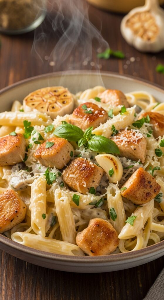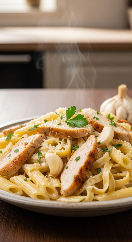 Creamy pasta dishes often feel heavy, but this recipe strikes the right balance. Garlic adds depth and fragrance, parmesan delivers salty richness, and heavy cream provides a smooth base that clings to every strand of pasta. The chicken not only makes the dish heartier but also soaks up the sauce for extra flavor.