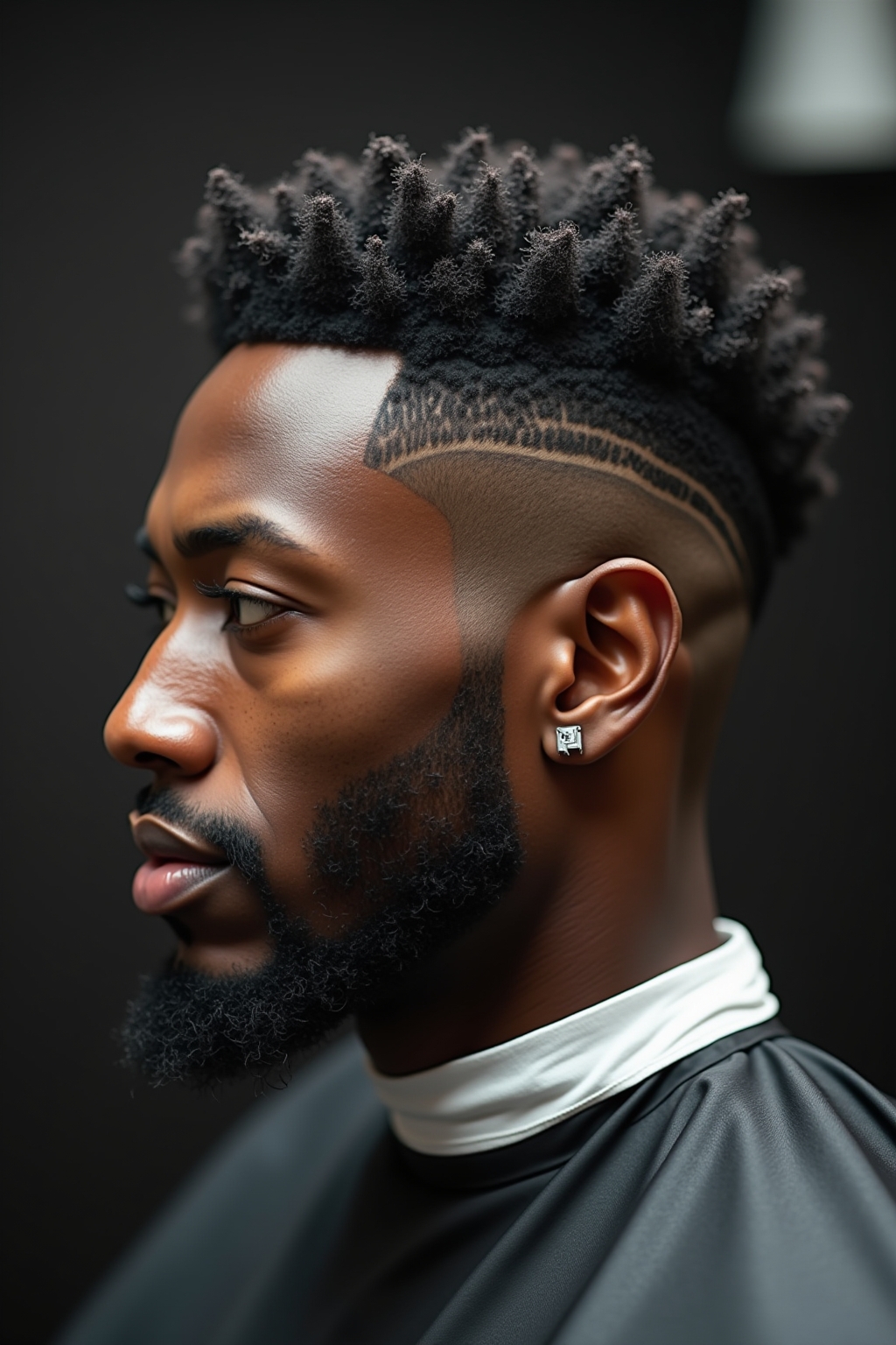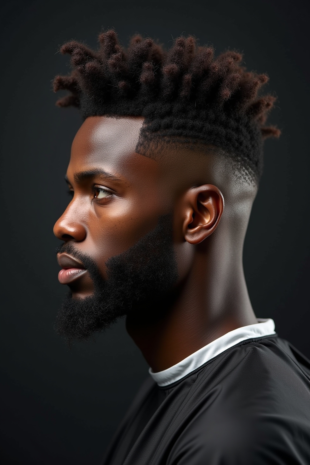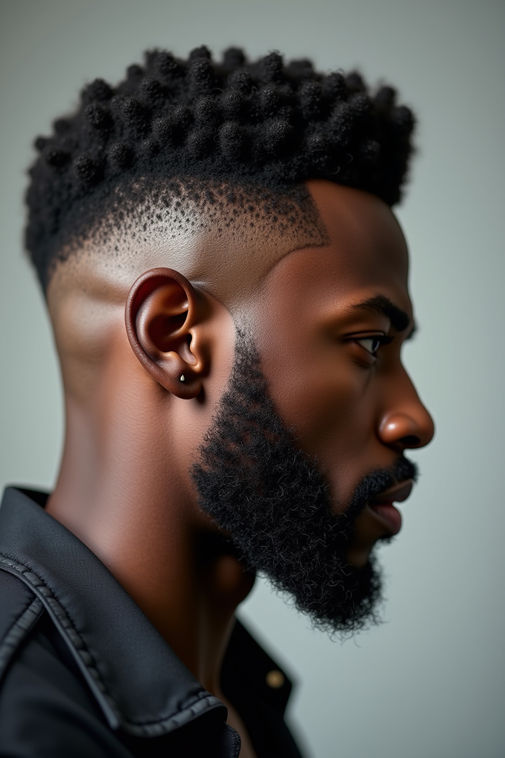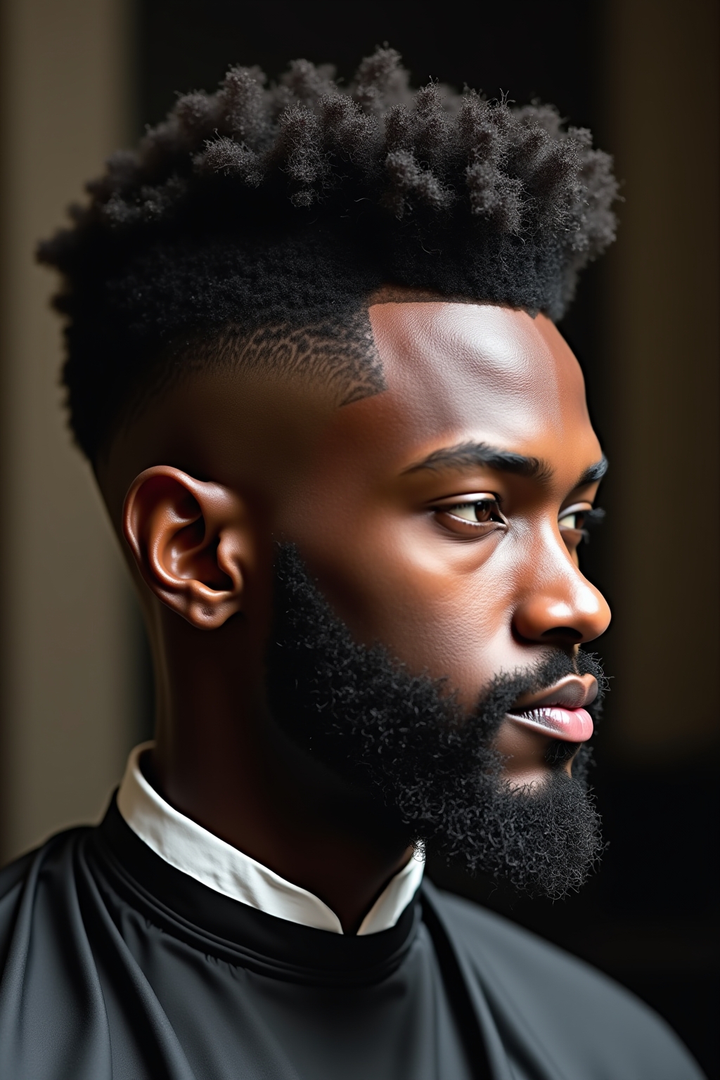 The textured high taper fade with beard creates a striking contrast between the closely trimmed sides and the voluminous top, perfectly complementing Black men’s hair texture. This sophisticated style maintains length on top while gradually fading down the sides, creating a clean silhouette that seamlessly transitions into a well-groomed beard. The textured elements on top add dimension and personality, allowing for versatile styling options from natural curls to more defined coils or waves. When paired with a shaped beard, this combination delivers a complete, masculine look that frames the face and highlights your strongest features.
