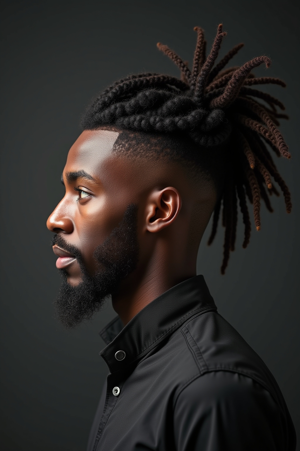 The Dreadlock High Taper Fade represents a perfect fusion of traditional Black hairstyling with contemporary barbering techniques. This distinctive style maintains the cultural significance of dreadlocks while incorporating the clean, gradual fade that defines modern Black men’s grooming aesthetics. The contrast between the textured, free-flowing locs on top and the precisely faded sides creates a striking visual balance that frames the face beautifully. For Black men seeking to honor their heritage while embracing current trends, this versatile cut offers the best of both worlds—traditional expression with a fresh, polished finish.