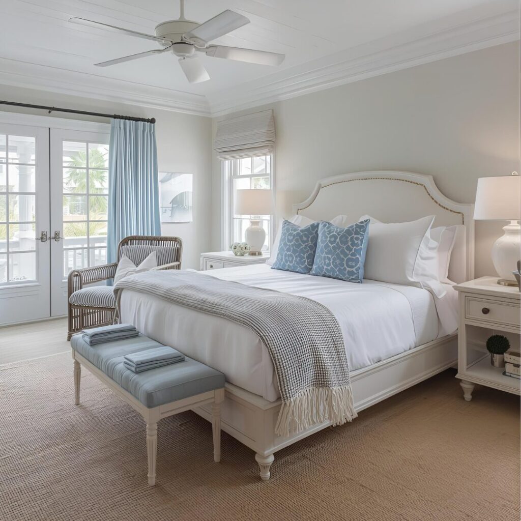Bring the calm of the seaside into your bedroom with light blues, sandy neutrals, and airy fabrics. Whitewashed furniture and natural textures like jute rugs complete the look.