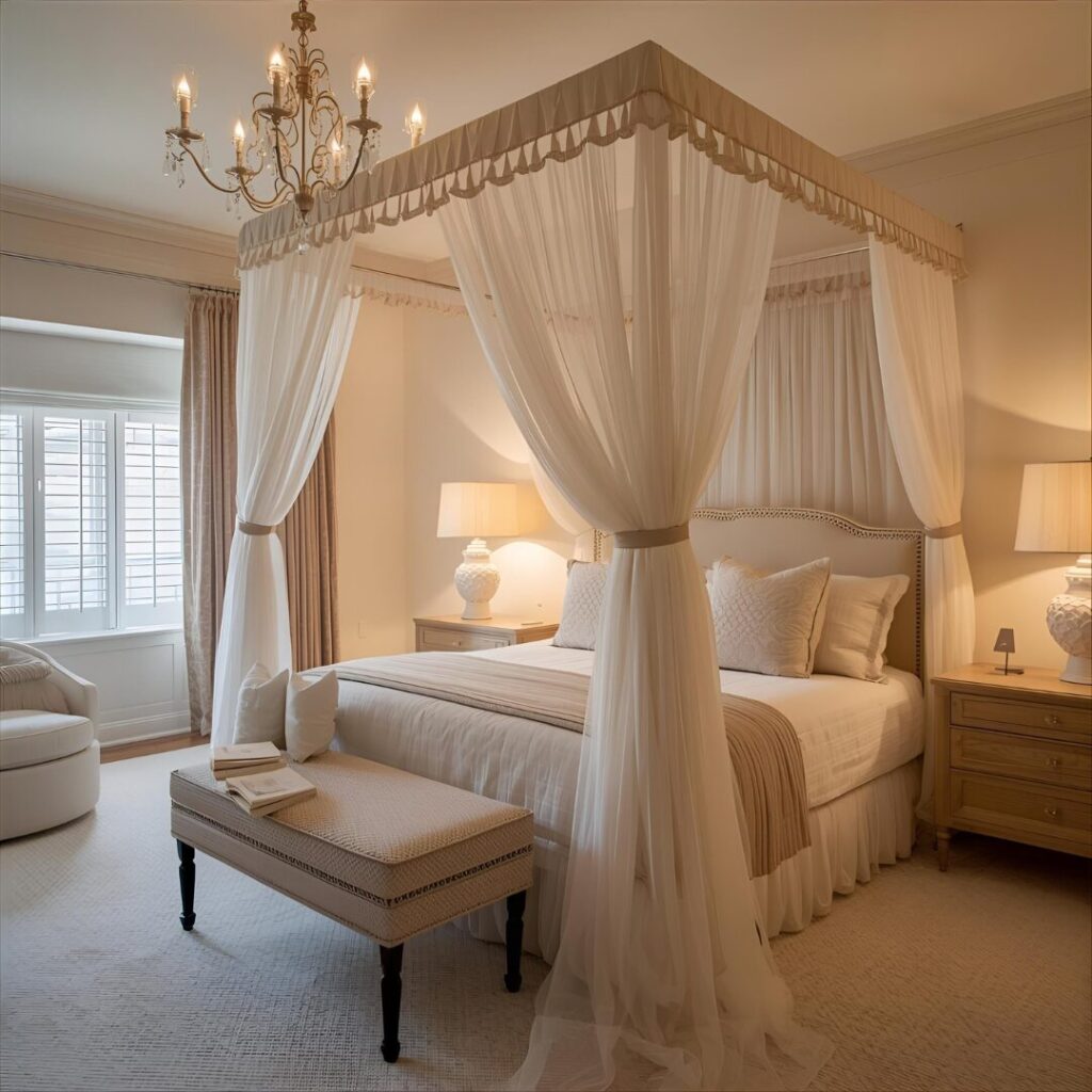 Romantic bedrooms use soft lighting, delicate fabrics, and soothing colors. Think pastel palettes, flowing drapes, and a canopy bed. Warm accent lighting enhances the intimate mood.