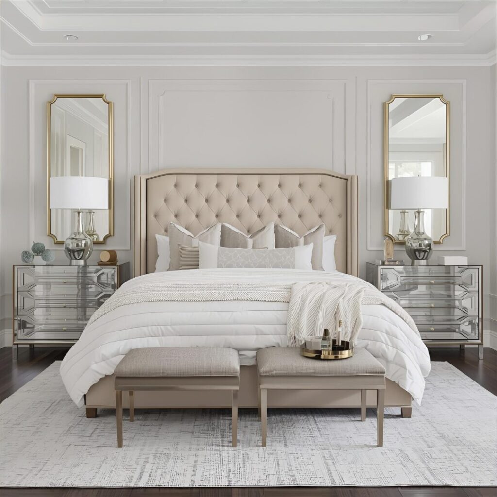 Pro Tip: A tufted upholstered headboard and crisp white linens instantly elevate the look.