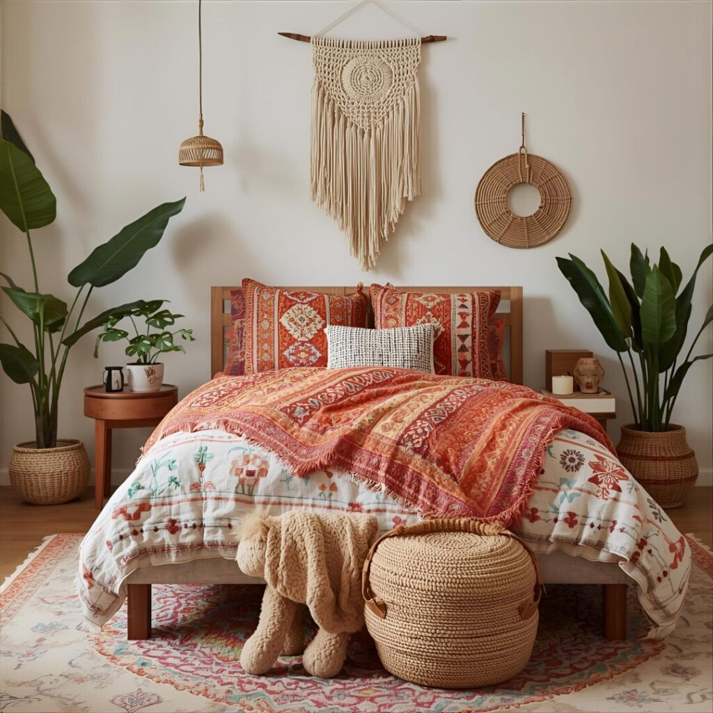 Boho interiors celebrate free-spirited charm with vibrant colors, eclectic patterns, and layered textures. Use woven rugs, macramé wall art, and indoor plants to add personality.