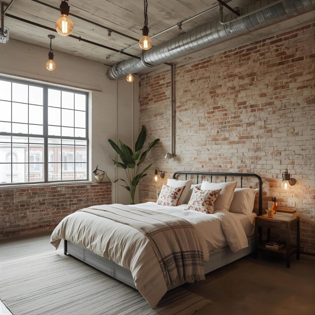 Industrial bedrooms combine raw materials like exposed brick, concrete walls, and steel furniture. Pair these rugged elements with warm lighting and soft textiles to balance the aesthetic.