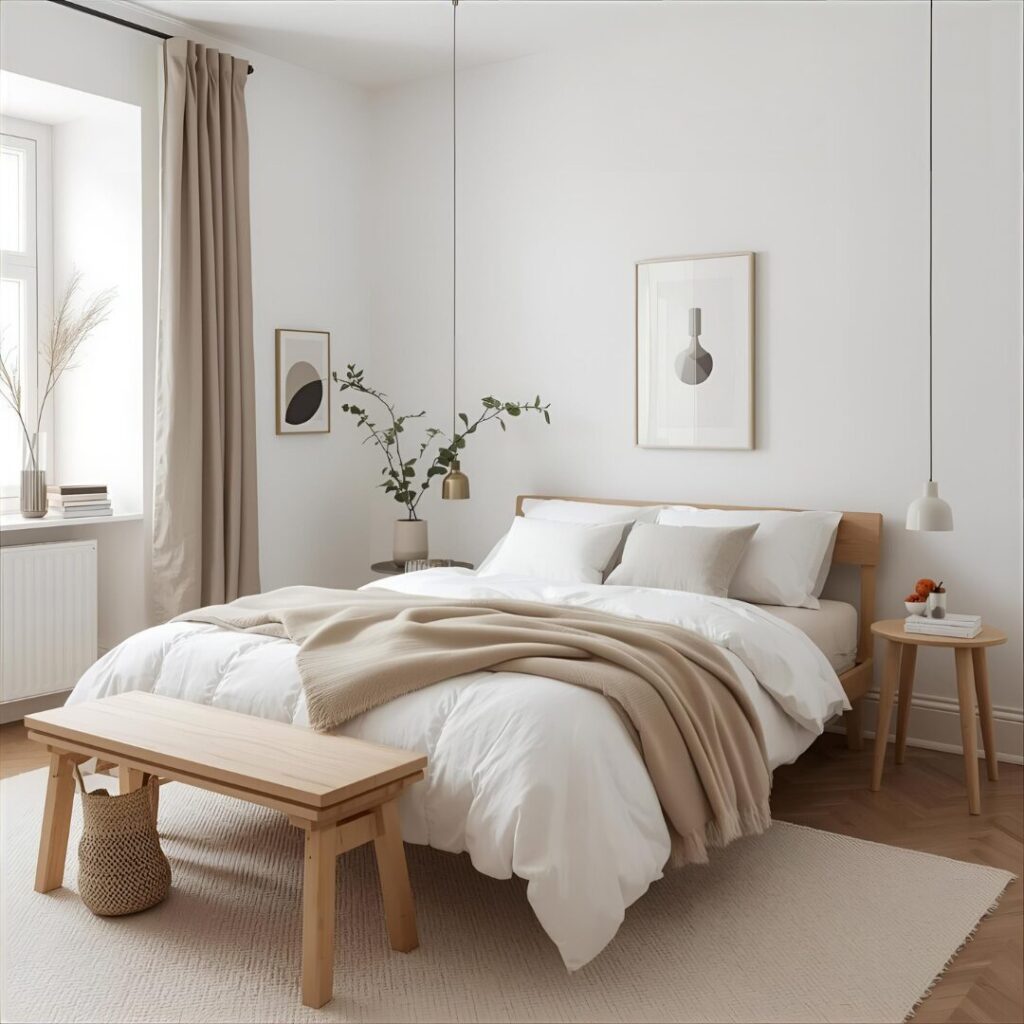 Scandi-style bedrooms focus on functionality, light, and coziness. Choose neutral palettes, simple wooden furniture, and soft natural fabrics. White walls with pops of muted colors create a calm atmosphere.