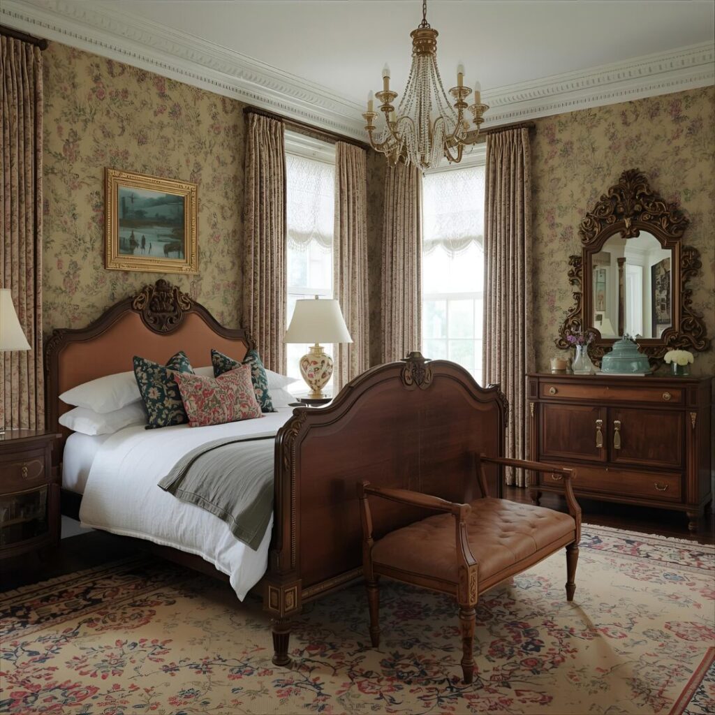 Vintage bedrooms feature ornate furniture, antique mirrors, and floral patterns. Choose classic wooden bedframes, lace curtains, and rich wallpapers to create a nostalgic vibe.