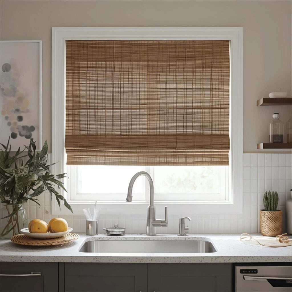 Woven bamboo or natural fiber shades bring organic texture, earthy warmth, and eco-friendly style to your kitchen through sustainable materials that filter light beautifully. These nature-inspired treatments are woven from bamboo, jute, rattan, seagrass, or other natural fibers, creating a textured appearance that adds dimensional interest and natural beauty. The woven structure allows soft, dappled light to filter through while still providing daytime privacy and reducing glare, creating the perfect ambiance for kitchen work. Natural fiber shades work beautifully in numerous design styles from coastal and tropical to modern organic, Japanese-inspired, or bohemian aesthetics. The neutral, earthy tones coordinate effortlessly with any color scheme while adding warmth that prevents kitchens from feeling too cold or sterile. Ideal for eco-conscious homeowners, coastal or tropical-themed kitchens, spaces embracing biophilic design, or anyone wanting to incorporate natural materials that connect indoor spaces to the outdoor world, bamboo and natural fiber shades create a relaxed, organic atmosphere that feels both current and timeless while supporting sustainable design choices.