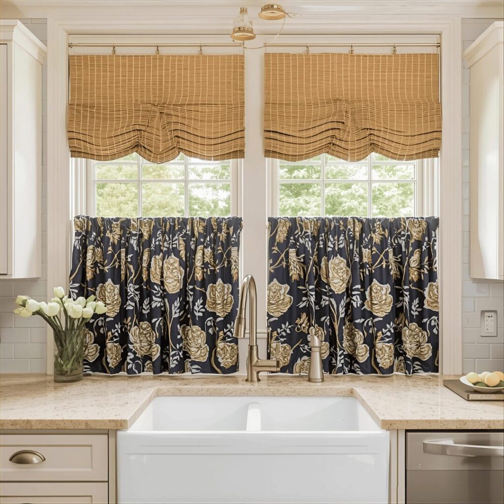 Layered window treatments combine multiple elementsโperhaps bamboo shades with fabric curtains, sheers behind printed panels, or a valance over cafรฉ curtainsโcreating depth, versatility, and designer-worthy sophistication. This luxurious approach allows you to control light and privacy with multiple layers while creating rich visual texture that elevates your kitchen’s entire aesthetic. The beauty of layering is its flexibilityโyou can adjust individual layers throughout the day depending on light needs, creating numerous looks and functionality options from a single window treatment. Layering also allows you to introduce multiple colors, patterns, and textures that work together to create a cohesive, complex design scheme that feels intentional and professionally styled. The dimensional quality of layered treatments adds architectural interest to plain windows, making them appear larger and more important while creating focal points that draw attention upward. Ideal for larger kitchen windows above sinks, homeowners who love luxurious, detailed interiors, those wanting maximum flexibility in light and privacy control, or anyone willing to invest in window treatments that make a significant design statement, layered treatments transform ordinary windows into stunning architectural features that anchor your entire kitchen’s design.