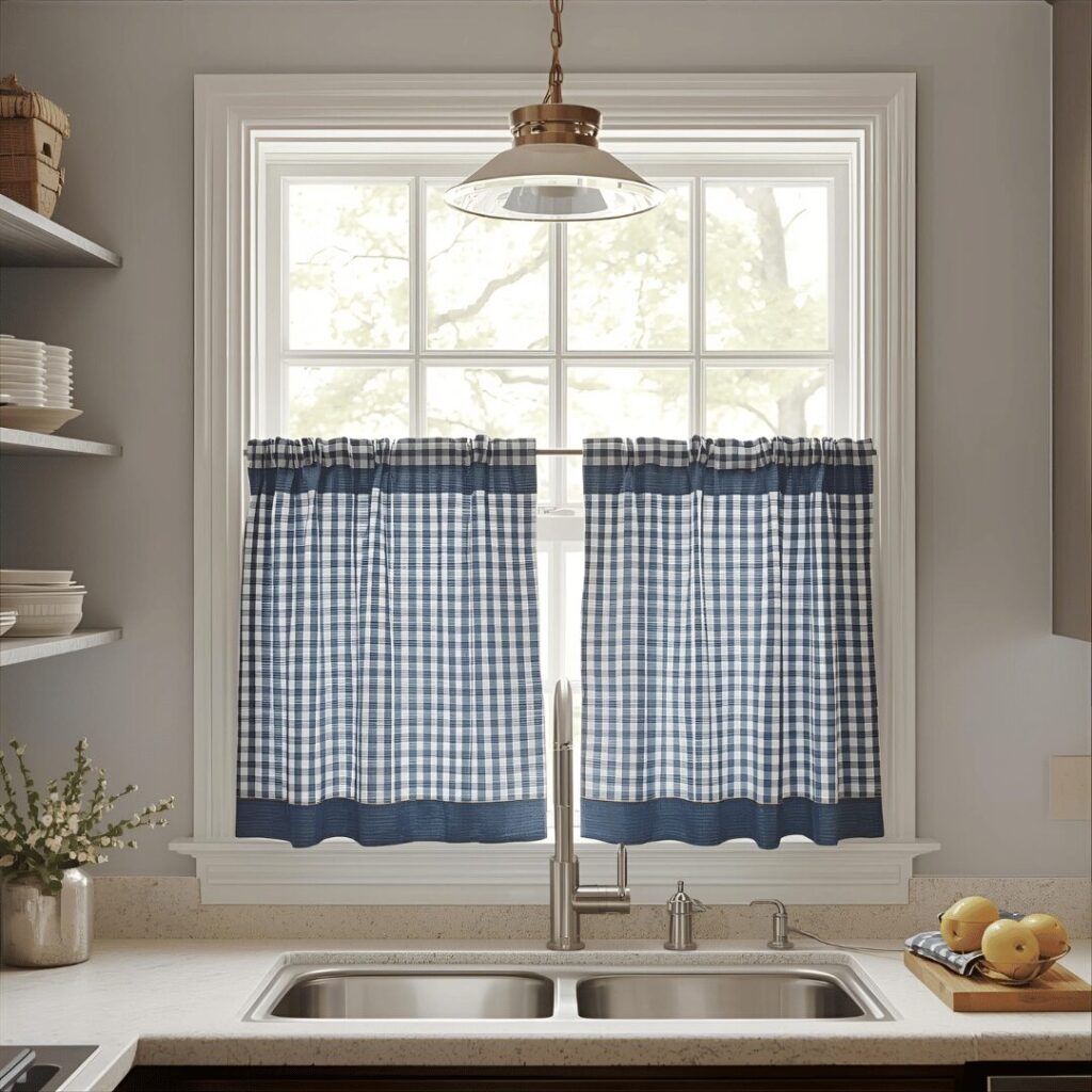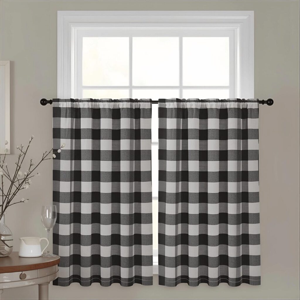 Farmhouse check patterns bring instant country charm and nostalgic warmth to your kitchen through timeless gingham, buffalo check, or windowpane patterns in classic color combinations. These cheerful patterns typically feature black and white buffalo checks for modern farmhouse style, red and white gingham for traditional country kitchens, navy and white checks for coastal farmhouse vibes, or neutral tan and white patterns for subtle sophistication. Check patterns add visual interest without overwhelming the space, working beautifully as cafรฉ curtains, valances, or full-length panels depending on your coverage needs and style preferences. The geometric regularity of checks creates a sense of order and tradition that feels comforting and homey, perfect for kitchens that serve as the heart of family life. Perfect for farmhouse-style kitchens, country cottages, traditional homes, or anyone wanting to inject personality and pattern into their kitchen without committing to bold florals or busy prints, check pattern curtains offer a timeless solution that photographs beautifully, coordinates easily with solid-colored kitchen accessories, and never feels dated or trendy despite their enduring popularity.