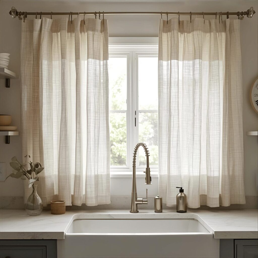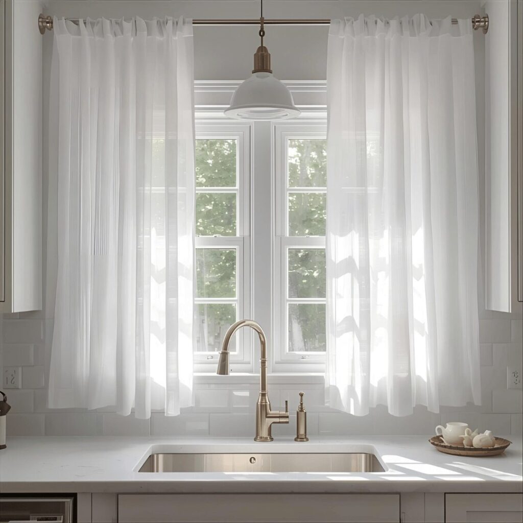Sheer white panels create an airy, ethereal look above your kitchen sink by filtering natural light beautifully while maintaining privacy and adding soft, romantic elegance. These lightweight, translucent curtains allow sunshine to glow through the fabric, creating a warm, inviting atmosphere in your kitchen without blocking the natural light that makes the space feel open and welcoming. Sheer panels work wonderfully in kitchens with ample natural light where you want to soften the intensity without creating darkness, and they provide daytime privacy while still allowing you to see shadowy outlines of your outdoor landscape. The flowing, delicate nature of sheer fabric adds movement and softness to kitchens that might otherwise feel too hard or clinical with their abundance of hard surfaces like countertops, cabinets, and appliances. Ideal for bright, white kitchens, coastal-themed spaces, Scandinavian-inspired designs, or any kitchen where you want to maintain an open, airy feeling while still having the finished look that curtains provide, sheer white panels offer the perfect solution for those who can’t decide between curtains and bare windows because they essentially give you the best of both worlds.