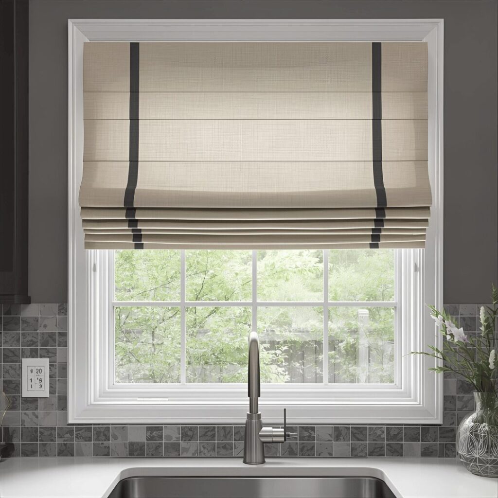 Roman shades offer a tailored, sophisticated window treatment that provides complete light control, privacy options, and a clean modern aesthetic perfect for contemporary kitchens. These fabric shades fold into neat horizontal pleats when raised, creating a stacked effect at the window’s top while leaving your view completely unobstructed when fully open. When lowered, Roman shades provide complete coverage with a flat, smooth appearance that looks custom and polished rather than casual like traditional curtains. Available in countless fabrics from light-filtering linen to room-darkening cotton, waterproof materials perfect for above-sink locations, or bold patterns that make a statement, Roman shades adapt to any style preference. The cordless lift mechanisms available today make them incredibly safe and easy to operate even with wet hands from kitchen tasks, and their minimal profile when raised means they virtually disappear when you want full light exposure. Perfect for modern kitchens, transitional spaces, anyone wanting precise light control throughout the day, or homeowners who prefer the tailored look of shades over the softness of curtains, Roman shades deliver sophisticated style with unmatched functionality.