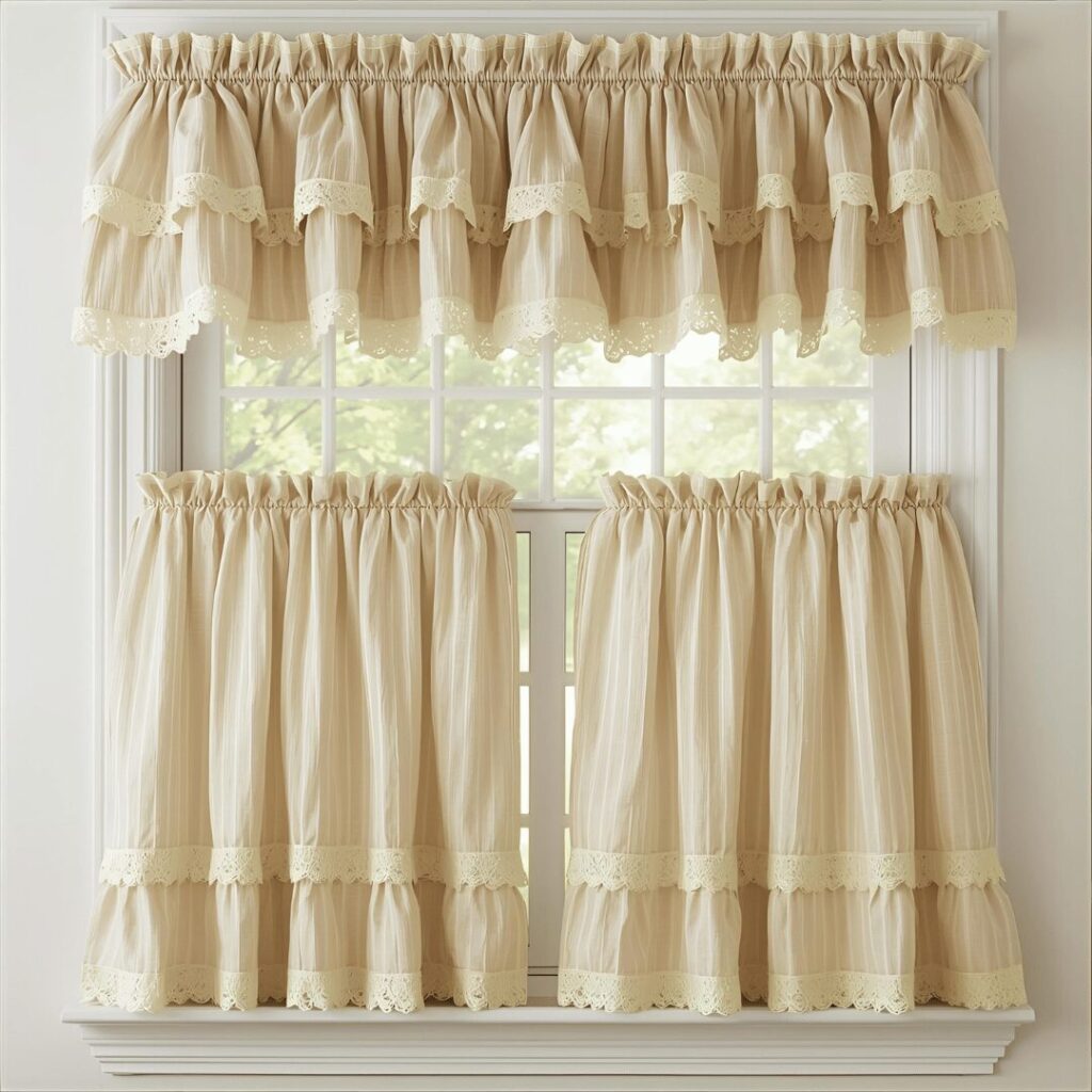 Ruffled tier curtains deliver charming country cottage style through sweet gathered fabric tiers that add feminine softness and vintage-inspired appeal to your kitchen. This romantic treatment typically features two or three separate curtain panels stacked vertically, often with ruffled edges, eyelet lace trim, or gathered details that create dimensional texture and visual interest. The tiered design allows you to adjust coverage by choosing different tier heightsโperhaps covering just the bottom third for privacy while leaving the top two-thirds open, or using multiple tiers for more complete coverage while maintaining the layered, romantic aesthetic. Ruffles and gathered fabric catch light beautifully, creating shadows and depth that make the window area feel special and thoughtfully decorated. Perfect for cottage-style kitchens, shabby chic interiors, vintage-inspired homes, or anyone who loves romantic, feminine design details, ruffled tier curtains transform a basic window into a charming focal point that evokes nostalgia and creates a cozy, welcoming atmosphere that makes your kitchen feel like the warm heart of a well-loved home.