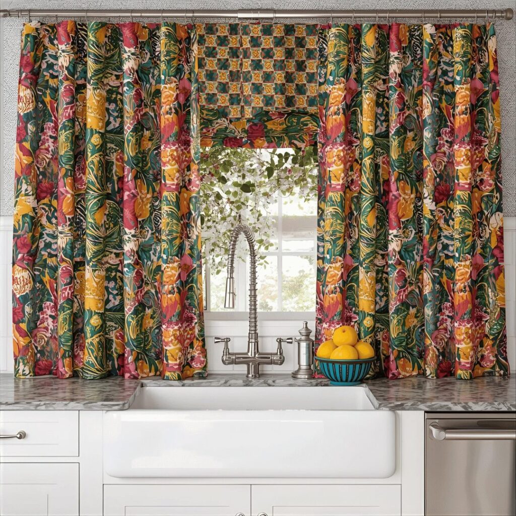 Bold patterned fabric curtains make a dramatic statement above your kitchen sink by introducing eye-catching prints, vibrant colors, and personality-packed designs that become instant focal points. This adventurous approach might feature large-scale florals, geometric prints, tropical leaves, Moroccan-inspired patterns, or any design that speaks to your personal style and complements your kitchen’s overall aesthetic. Bold patterns work particularly well in kitchens with neutral cabinets and countertops, where the curtains can serve as the main source of color and visual interest without competing with other decorative elements. The key to pulling off bold patterns successfully is ensuring they coordinate with at least one other element in the kitchenโperhaps picking up accent colors from dishes, rugs, or artwork. Ideal for confident decorators who aren’t afraid of pattern, eclectic kitchens that celebrate personality over perfection, or spaces that need a injection of energy and life, bold patterned curtains prove that kitchen window treatments don’t have to be subtle or neutralโthey can be show-stopping design elements that express your unique style and make your kitchen unforgettable.