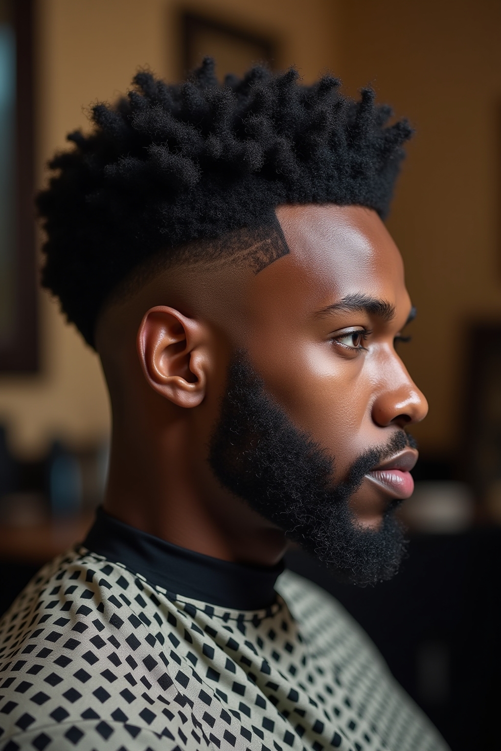 - Well-groomed facial hair enhances jawline definition alongside a low afro taper fade.