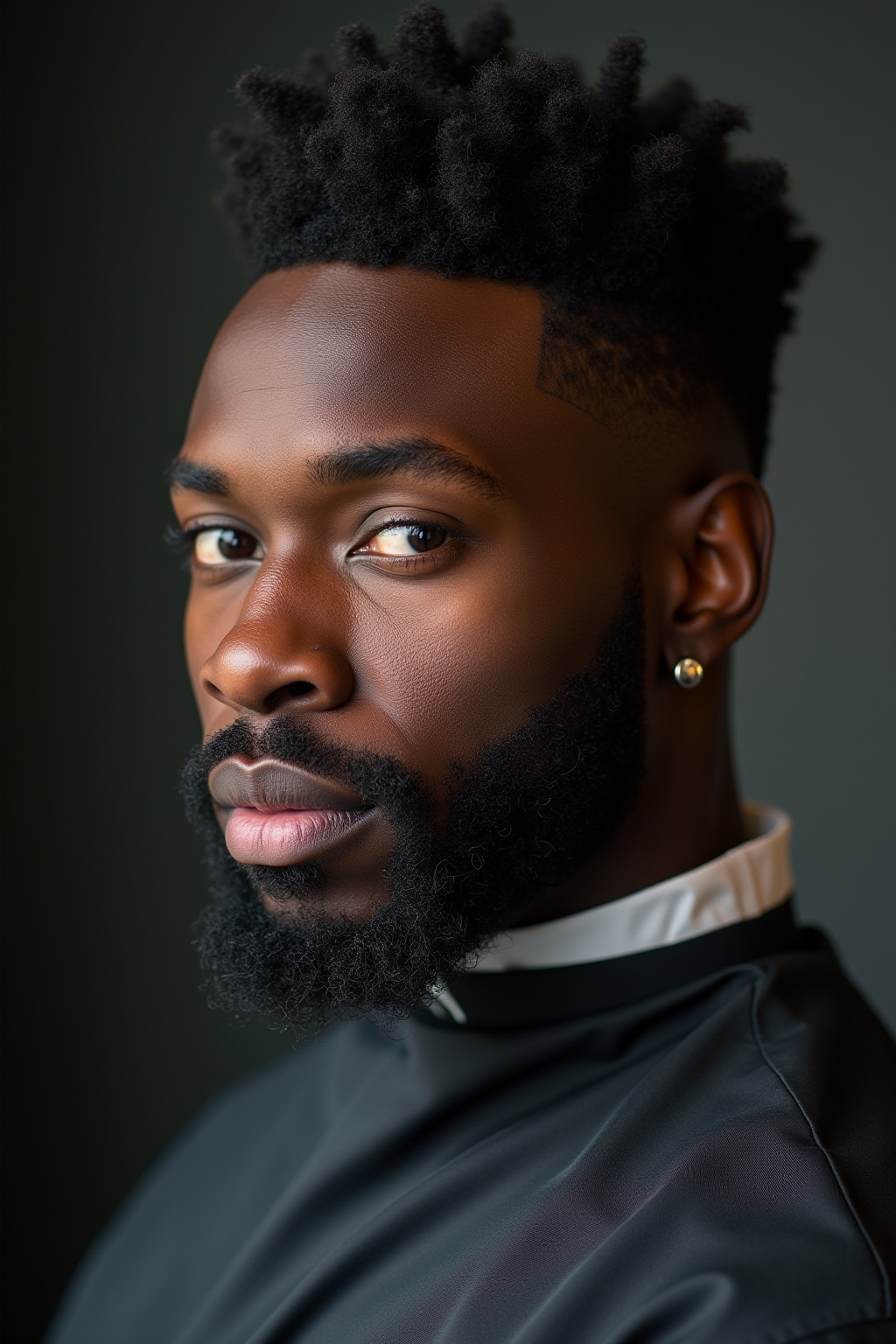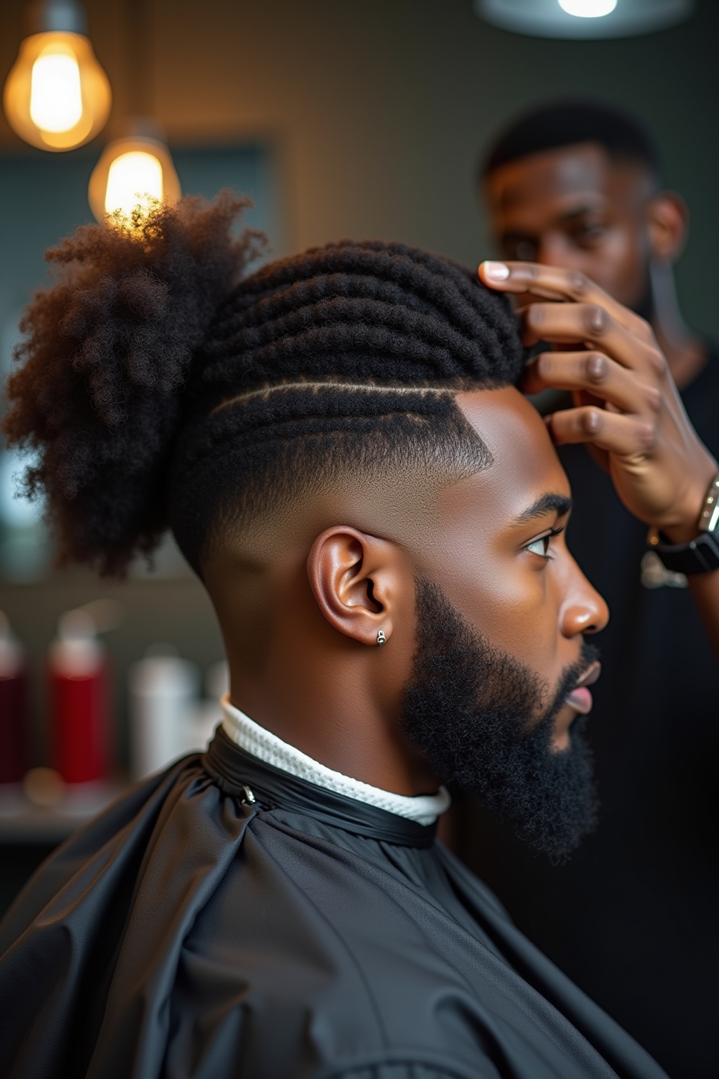 The low afro taper fade can be significantly enhanced when paired with the right beard style, creating a balanced and sophisticated appearance for Black men. Well-groomed facial hair adds definition to the jawline, complementing the clean lines of the fade and drawing attention to the face’s natural contours. For those with thicker beard growth, combining a full beard with a low afro taper fade creates a striking contrast between the closely cut sides and the voluminous facial hair. Alternatively, those preferring a more subtle look can opt for a neatly trimmed goatee or stubble, which maintains the clean aesthetic of the low fade while adding just enough facial definition.
