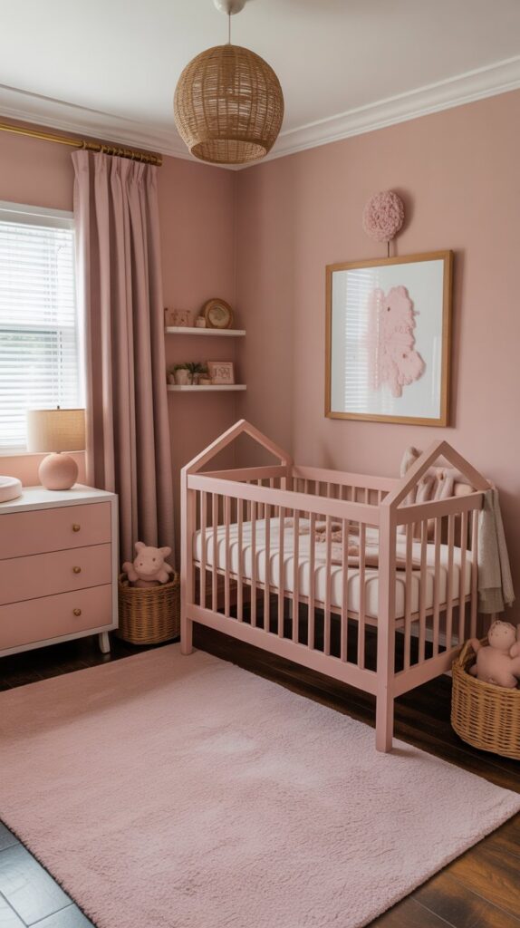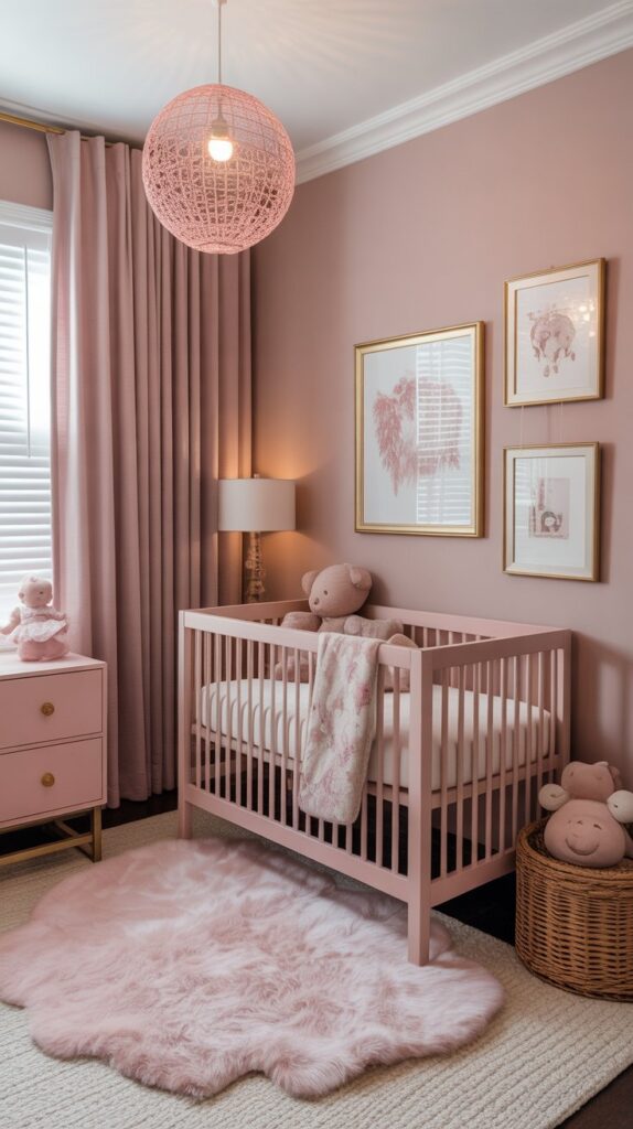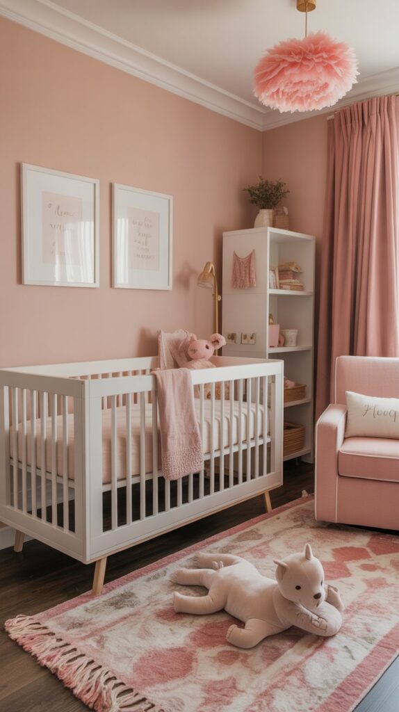 You can mix matte and glossy textures to catch the light differently. Light wood or white furniture helps maintain a fresh and open atmosphere. Pale pinks also pair well with subtle grays and natural elements to create a peaceful, timeless nursery.