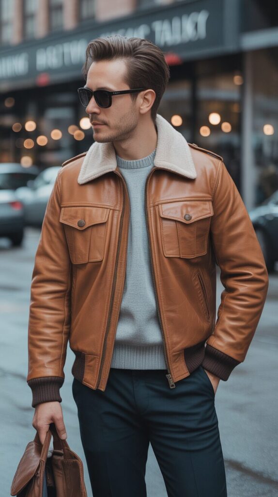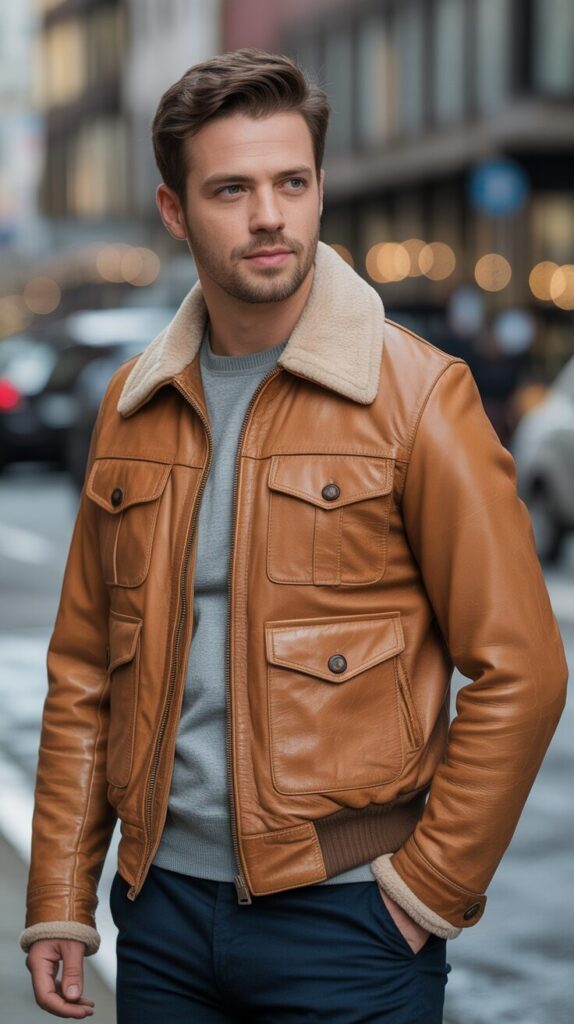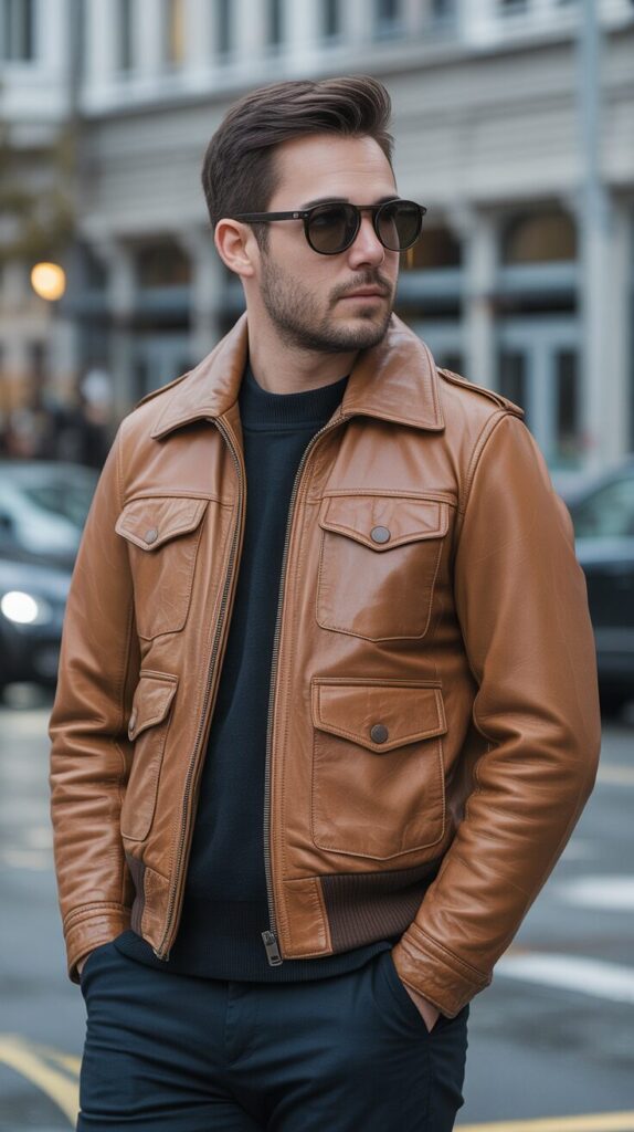 Camel is one of the most versatile colors in men’s fashion. Its warm, natural tone pairs easily with neutral, dark, and earth-tone outfits. This makes the camel flying jacket easier to style than black or brown leather jackets. The soft tan shade enhances a mature, masculine aesthetic without looking too bold. It also photographs well, making it perfect for social media style posts. Camel outerwear always delivers a premium, timeless look.