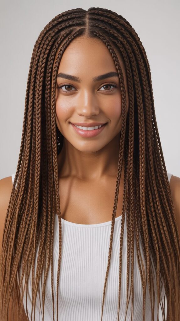 Make a dramatic statement with waist-length micro braids that create a stunning visual impact and offer endless styling possibilities. These extra-long braids require more installation time and maintenance but reward you with a show-stopping look that few other styles can match. The length allows for elaborate updos, intricate patterns, and breathtaking styles that shorter braids cannot achieve. Be prepared to care for these lengthy braids with regular moisturizing and gentle handling to prevent tangling and maintain their beautiful appearance. This style is perfect for special occasions, photoshoots, or when you simply want to embrace your inner goddess with a truly remarkable hairstyle.