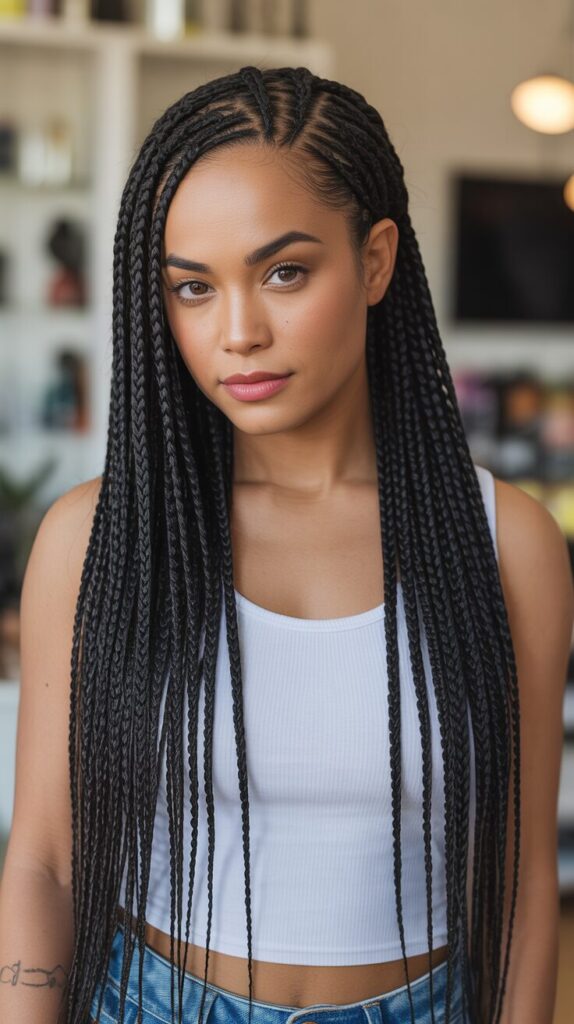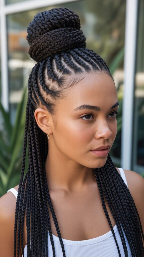 Achieve instant sophistication by gathering your micro braids into a sleek high bun that elevates your look for any formal occasion or hot summer day. This style beautifully showcases the intricate pattern of your braids while keeping hair off your neck and face for ultimate comfort and practicality. Create a smooth, polished finish by wrapping braids neatly around the base, or opt for a slightly textured look by allowing some pieces to frame your face softly. The high bun works exceptionally well with micro braids of various lengths, from shoulder-grazing styles to longer versions that create a more substantial bun. Accessorize with decorative hairpins or wrap a few braids around the bun’s base for an added touch of elegance.