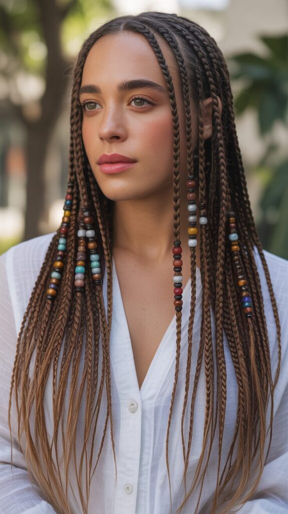 Channel free-spirited bohemian vibes by adorning your micro braids with strategic beaded accents that create visual interest and musical charm. Incorporate colorful glass, wooden, or metallic beads throughout your braids, focusing on the ends or creating patterns that frame your face. The gentle clicking sound of beads adds a sensory element to this style, making every head turn a delightful experience. You can coordinate bead colors with your outfit or choose neutral tones for everyday wear. This style works beautifully with both long and medium-length braids, offering a personalized touch that reflects your creative personality and attention to detail.