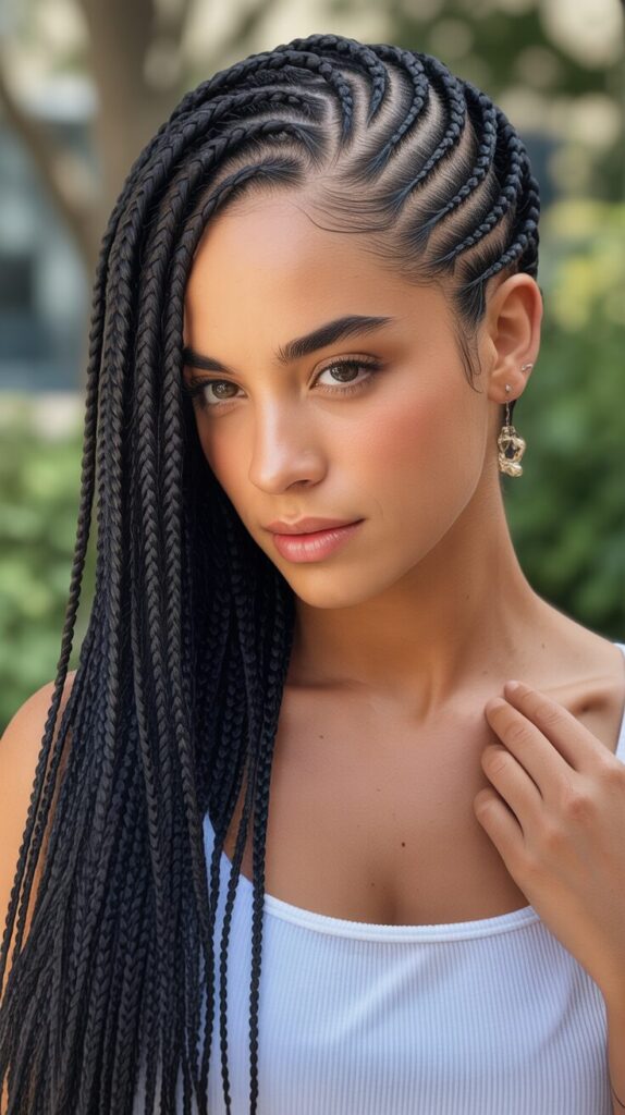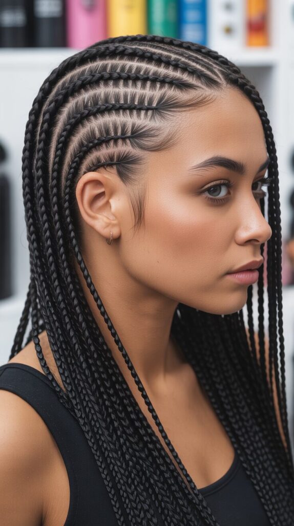 Embrace contemporary edge by combining the softness of micro braids with the bold statement of shaved designs on the sides or back of your head. This striking contrast between delicate braids and bare scalp creates a fashion-forward look that’s both feminine and powerful. Work with your stylist to create geometric patterns, lines, or more organic designs that reflect your personality. The shaved sections also offer practical benefits by reducing the overall weight and density of the style, making it more comfortable and manageable. This bold style celebrates the beauty of contrast and is perfect for the confident woman who isn’t afraid to stand out.