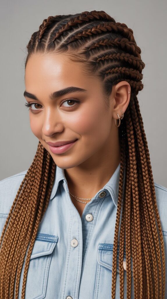 Master the art of balance with a half-up, half-down micro braid style that offers the best of both worlds—showing off your beautiful braids while keeping hair away from your face. Create a small crown by gathering the top section of your braids and securing them at the back of your head, allowing the remaining braids to flow freely down your back. This style is perfect for highlighting your facial features while maintaining the protective benefits and beauty of your micro braids. You can add interest by creating a small braided pattern within the top section or incorporating hair jewelry where the sections meet. It’s an ideal choice for both casual everyday wear and special occasions.