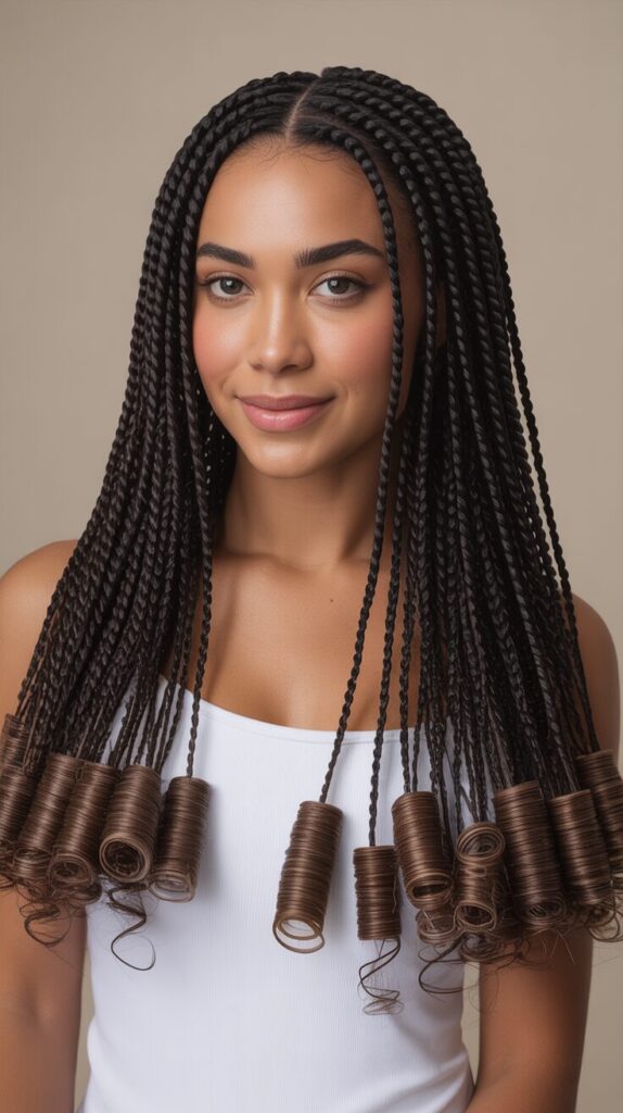 Add unexpected texture and playful flair to your micro braids by creating soft, bouncy curls at the ends for a stunning contrast. Use small perm rods or flexi rods on the ends of your braids, applying a light setting lotion before rolling to create defined curls that will last for weeks. The combination of sleek braids and curly ends creates visual interest and movement that will turn heads wherever you go. This style works particularly well with synthetic hair extensions that hold curls beautifully, allowing you to maintain the style throughout your wear. The curly ends add volume and a touch of romance to your overall look, making it perfect for weddings, parties, or simply when you want to feel extra special.