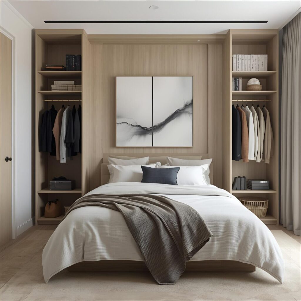 One hallmark of minimalism is eliminating visible clutter. Storage beds, under-bed drawers, or built-in wardrobes help keep the room neat.