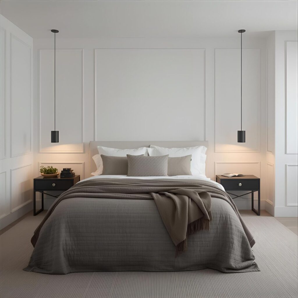 A sleek pendant light or a pair of simple bedside lamps can act as functional art in a minimal bedroom. Lighting creates depth without clutter.