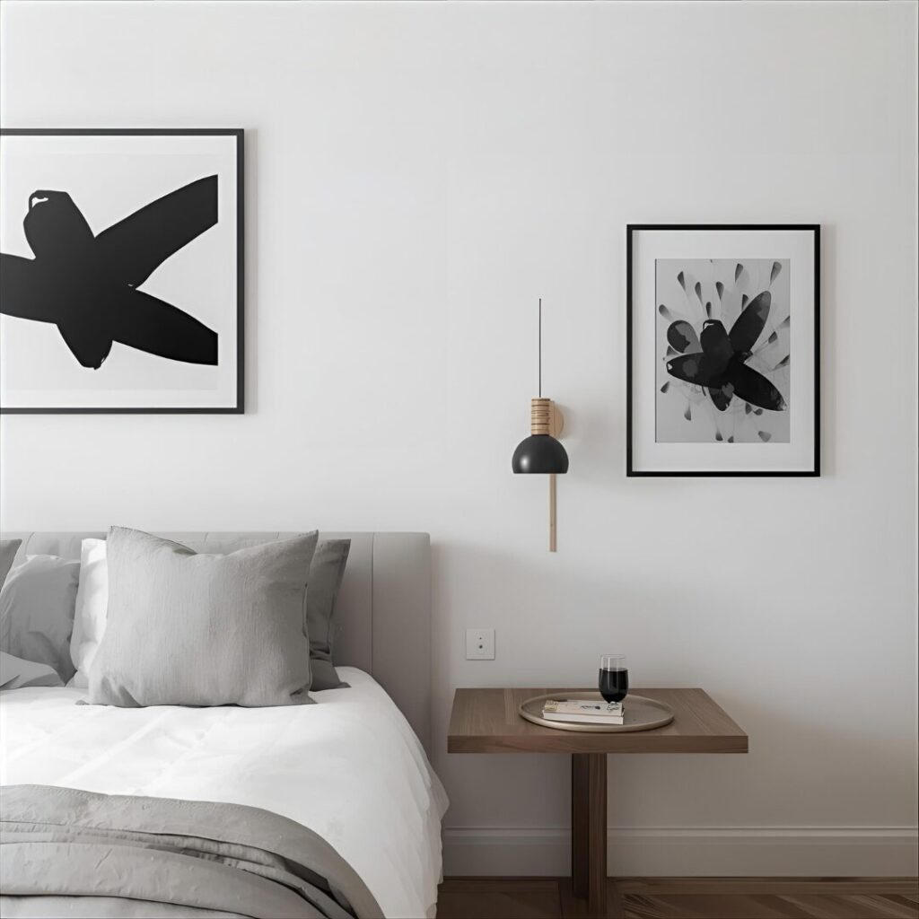 Minimalist bedrooms benefit from a few carefully chosen pieces of art rather than busy walls. Abstract prints or monochrome photography work well.