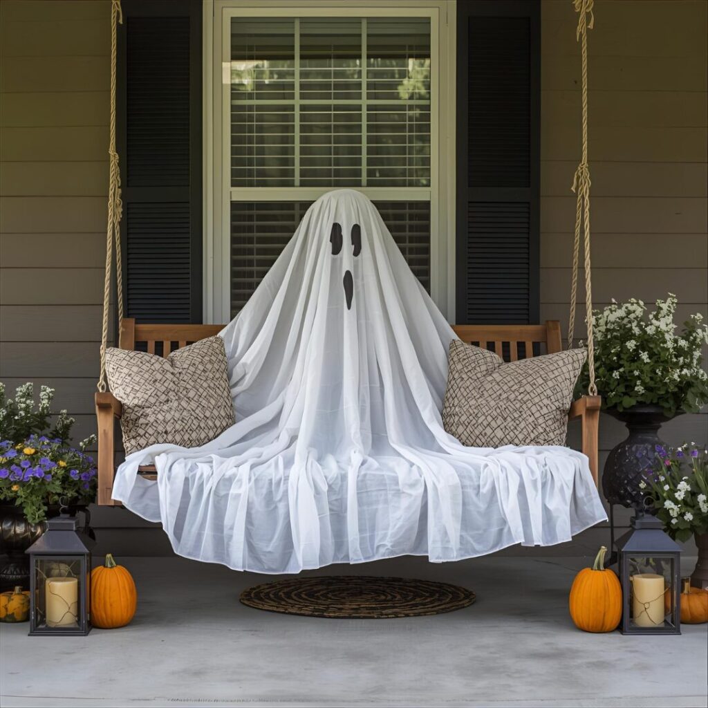 Drape an old sheet over a porch swing and add painted eyes for a ghostly figure. Accessorize with pumpkins or lanterns around the swing. When it moves slightly in the breeze, it adds a chilling vibe. It’s an easy yet memorable touch.