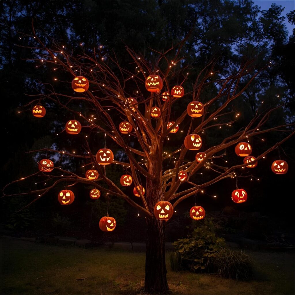 Hang small carved or faux pumpkins with lights from tree branches. At night, the tree glows with multiple spooky faces. It creates a dramatic, whimsical effect that kids and adults love. This DIY project is a showstopper for any yard.