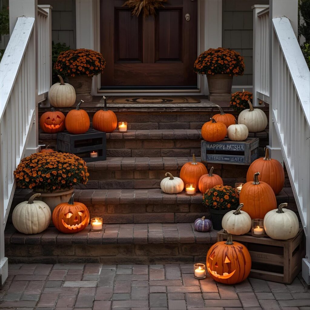Carved pumpkins with candles or LED lights never go out of style. Arrange them on stairs, railings, or in rustic crates for a layered effect. Mix traditional orange pumpkins with white or painted black ones for a modern twist. This sets a festive tone right at the entrance.