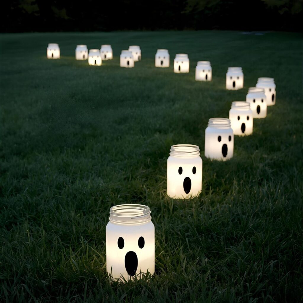 Create lanterns from old mason jars by painting them white and adding ghost faces. Place LED lights inside and line them along pathways or driveways. These glowing ghosts guide trick-or-treaters and add playful charm. They are simple, affordable, and family-friendly.