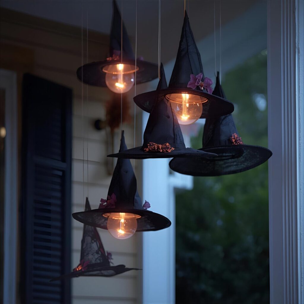 Suspend lightweight witch hats from your porch ceiling using clear fishing line. Add battery-operated lights inside to make them glow in the dark. This floating illusion creates a magical and spooky atmosphere. It’s an eye-catching decoration for guests and passersby.