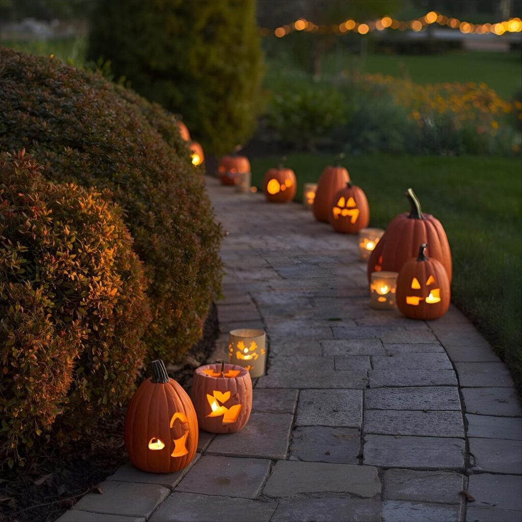 Line your driveway or walkway with hollowed mini pumpkins holding LED tea lights. The warm glow creates a welcoming yet spooky vibe. It’s a perfect way to guide trick-or-treaters to your door. These lights look charming in groups.