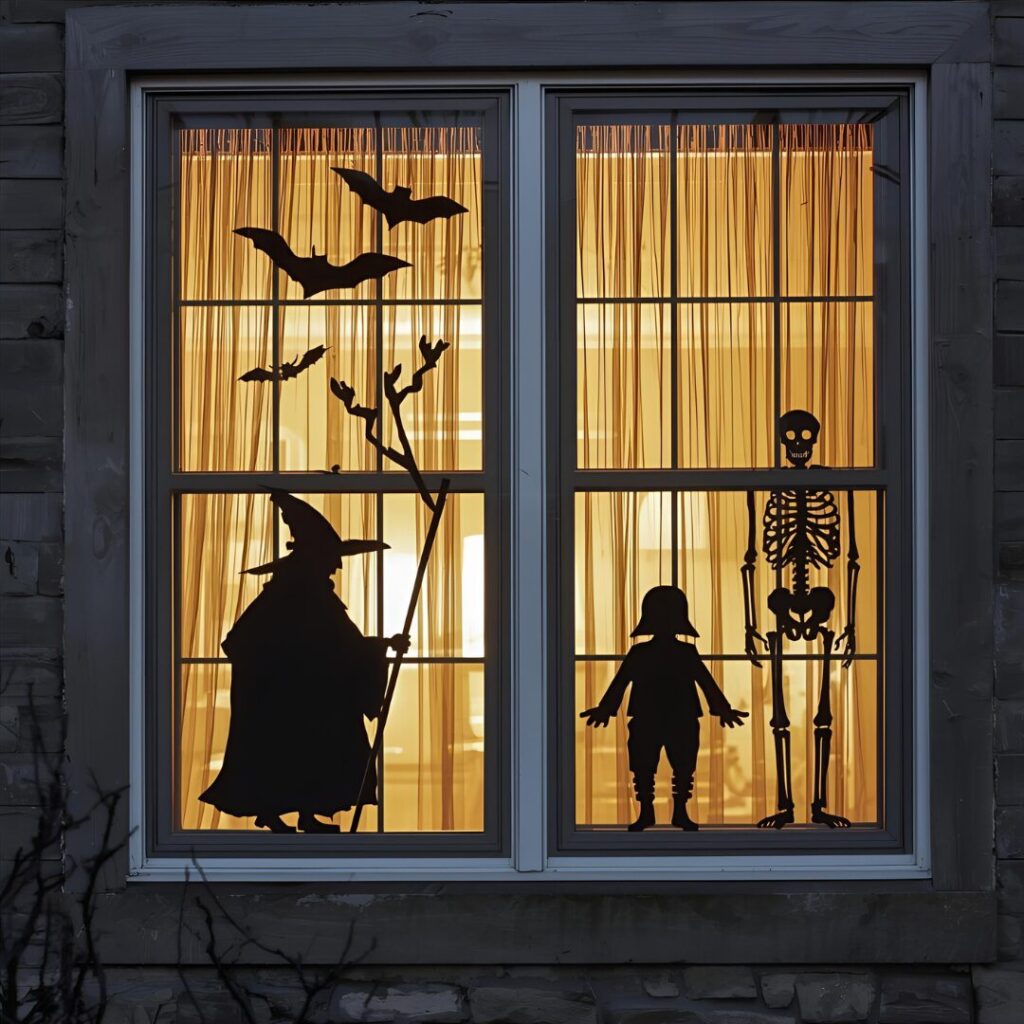 Cut out spooky figures like witches, bats, or skeletons from black cardboard. Place them against your windows and backlight them from inside. At night, the silhouettes create eerie scenes. It’s a low-cost but striking decoration idea.