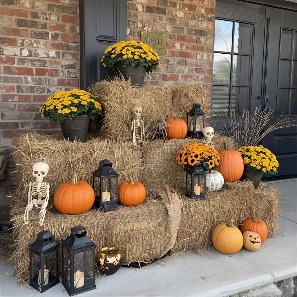 Stack hay bales on your porch or yard and decorate them with pumpkins, lanterns, and skeletons. This rustic setup combines fall harvest charm with Halloween spirit. It also doubles as a seasonal photo backdrop. Perfect for farmhouse-inspired outdoor decor.
