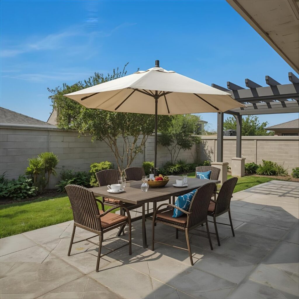 A dining table set under the open sky creates a perfect setting for family meals and gatherings. Pair with durable chairs and shade options like an umbrella or pergola.